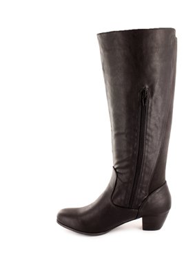 Black manmade leather universal width boot with round toe. Elasticated strip on the back of the shaft makes this boot ideal for all leg Widths.3.5 cm heal. Sizes 32-46
